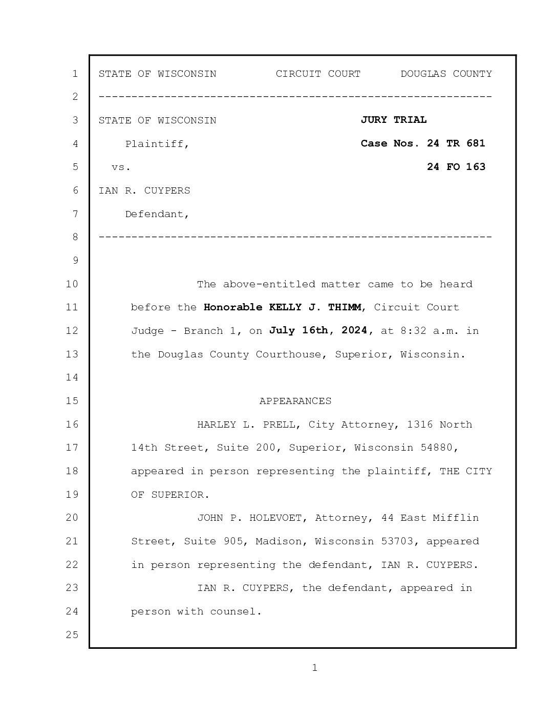 On July 16, 2024, Douglas County Circuit Judge Kelly Thimm presided over the City of Superior v. Ian Cuypers jury trial. The transcript documents opening statements and witness testimony from City Attorney Frog Prell and Officers Justin Taylor, Taylor Gaard, and Matthew Brown regarding Cuypers’s alleged obstruction and traffic violation.