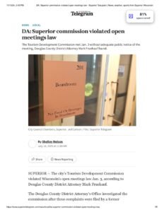 This Superior Telegram article, published July 18, 2023, by reporter Shelley Nelson, details the findings of Douglas County District Attorney Mark Fruehauf regarding Wisconsin’s open meetings law violations by the City of Superior Tourism Development Commission. The DA concluded that the commission’s January 3, 2023 meeting was improperly noticed, with the agenda posted only four and a half hours before the meeting rather than the required 24 hours.