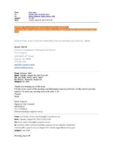 This August 30, 2022 email thread includes City of Superior officials and residents discussing the ongoing confusion over the Paine Property conservation easement near Barker’s Island. Councilor Jenny Van Sickle corresponded with Thomas Paine, who expressed concerns about unclear boundaries related to a relocated bird sanctuary. Van Sickle sought assistance from the Wisconsin Department of Natural Resources (DNR), involving DNR representative Cherie Hagen and City staff including Jason Serck, Mark Johnson, and Stephanie Becken.