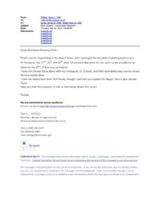 This May 30, 2019 email from Wisconsin Department of Natural Resources (DNR) attorney Diane L. Milligan to City of Superior Attorney Frog Prell initiates scheduling for a meeting on the Paine property conservation easement. Milligan thanks Prell for his earlier response to her May 9 letter and offers three possible dates—June 17, 25, or 26—after 10 a.m. each day, noting she could travel to Superior on June 17 if helpful. She also copies DNR colleagues James W. Lemke and Peter B. Wolter and inquires whether Prell has been able to contact the Paines, mentioning the Mayor shares their last name.