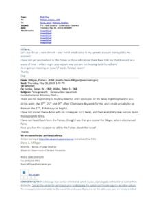 This email thread dated May 30, 2019 concerns coordination between Frog Prell and Wisconsin DNR attorney Diane L. Milligan regarding the Paine property conservation easement. Milligan follows up on a May 9 letter, proposes several June meeting dates, and notes she has not heard from the Paines despite the Mayor sharing their name. Prell starts a new thread, explains others advised contact with the Paines may be unproductive, and agrees an in-person meeting on June 17 works, asking Jason Serck to confirm. Additional DNR staff are copied, including James W. Lemke and Peter B. Wolter, with Heather Peterson also cc’d.