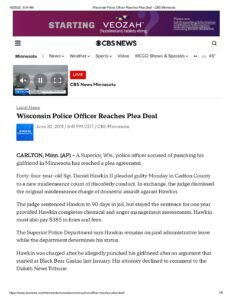 This news report dated June 20, 2011 covers the criminal case of Superior, Wisconsin police sergeant Daniel Hawkin II, age 44, following an alleged domestic assault. According to the report, Hawkin was accused of punching his girlfriend after an argument that began at Black Bear Casino in January. He was originally charged with misdemeanor domestic assault in Carlton County, Minnesota.