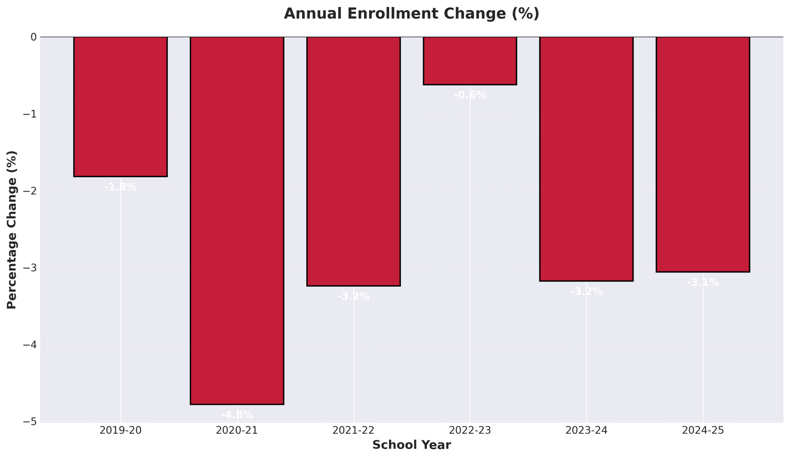 The sharpest dip was in 2020-2021, when families took one look at Zoom kindergarten and said, “Hard pass.” You could’ve taught math with interpretive dance and a puppet named Fraction Fred, and those kids still weren’t logging in.