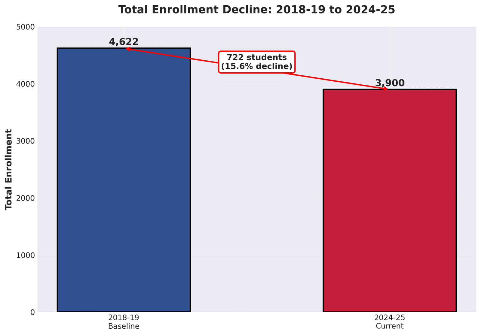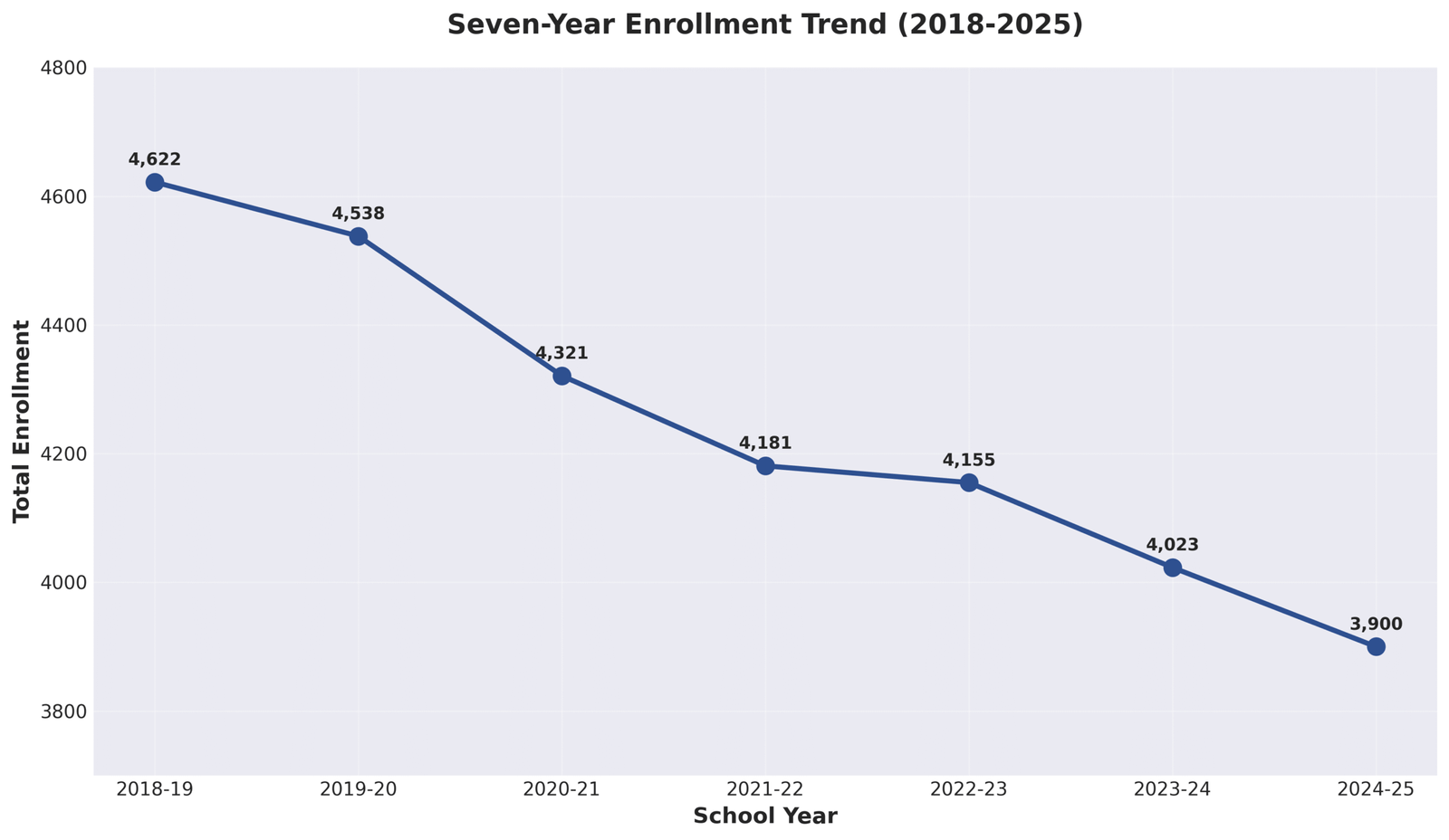 From 2018 to 2025, Superior Public Schools lost 722 students. That’s not a trickle—that’s a hemorrhage. We started at 4,622; now we’re sitting at 3,900, which is basically the school district equivalent of the Titanic playing musical chairs.