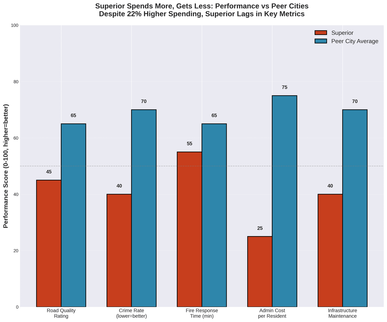 Public Safety: Superior spends roughly on par with peer cities for police and fire services when adjusted for population. The difference? Other communities are getting better results. Stevens Point’s crime rate is 18% lower than Superior’s despite similar per-capita spending on law enforcement. Marshfield’s fire department response times are faster with a leaner budget.